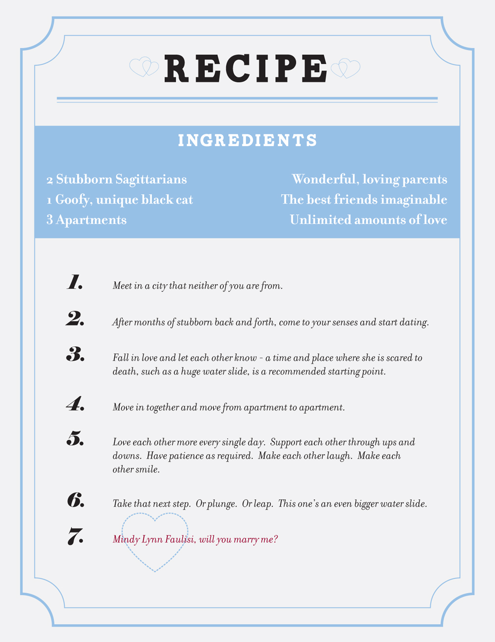 She is a fantastic cook (I'm spoiled), and I decided to design a "recipe" card that listed elements of our relationship and daily life in place of steps and ingredients.